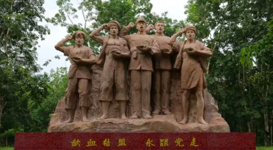 《歃血结盟,永跟党走》纪念雕塑是由我省著名雕塑家陈学博创作,他通过考证和深入调研,生动刻画了马白山等两位党代表和3位黎族代表,手捧着鸡血酒,正在宣誓结盟的庄严情景。栩栩如生的形象再现了琼崖革命中黎族、汉族人民的勠力同心,永跟党走。
