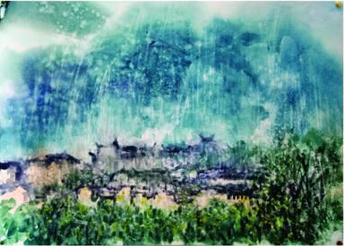 水彩画有其技法掌握上的必然性,水的控制难度较大,时常出现偶然情况,如意外的水渍现象,画家应不失时机把握住这些偶然因素,必然与偶然的结合,常会出现意想不到的艺术情趣,《山村》就是画家巧妙利用水渍的生动例证。从《古镇》、《夕阳》的用笔、用色方面可以明显感到画家力求从中国传统水墨画中汲取滋养,既有西画的注重结构,又强调了中国传统绘画“线”的意向性,在用色上减弱了水彩画的色彩性绘画用色的鲜明度,以求得色彩的统一和淡雅,流露出中国传统写意画的意趣。