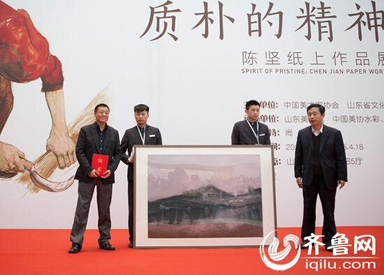 王廷琦副厅长、徐里秘书长、李翔副主席、范迪安院长、广军教授、唐国强先生、姜育恒先生先后致辞,陈坚先生致感谢辞。在开幕式上,为回馈家乡、表示对山东美术事业的支持,陈坚先生将本次展出的四幅水彩精品无偿捐赠给山东美术馆,柳延春书记代表山东美术馆接受捐赠并向陈坚颁发收藏证书。开幕式由中国美协《美术》杂志执行主编、著名美术理论家、批评家尚辉主持。