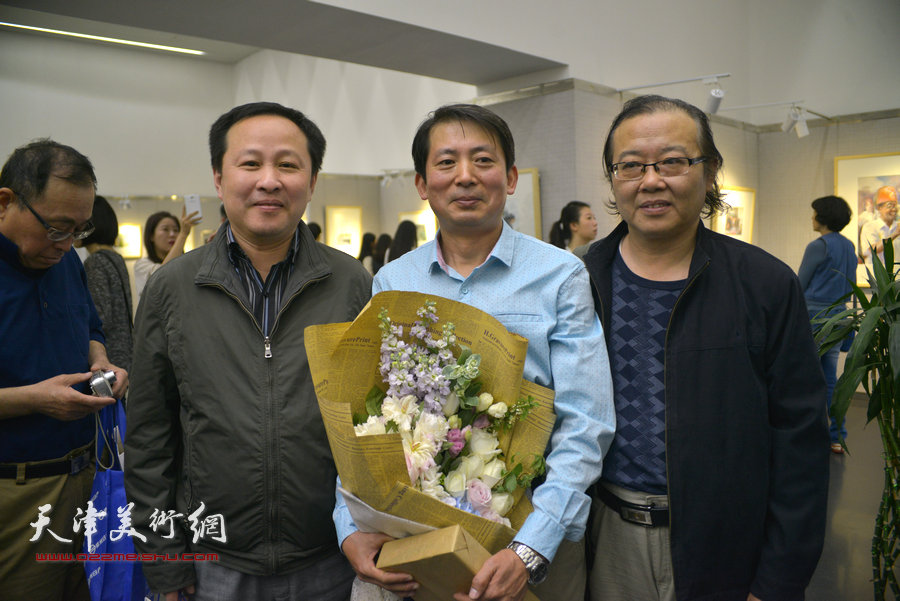 图为王刚、魏瑞江、常金祥在画展现场交流。