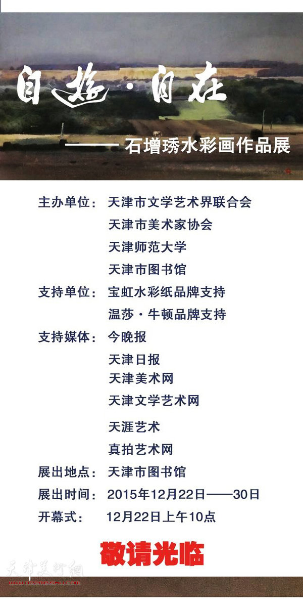 天津美术网讯 由天津市文学艺术界联合会、天津市美术家协会、天津师范大学、天津市图书馆主办的“自游•自在——石增琇水彩作品展”将于2015年12月22日上午10点在天津市图书馆举行开幕式。