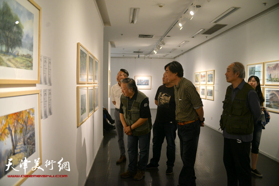 石增琇、杜晓光、王宝響、杨俊甫在画展现场观看作品。