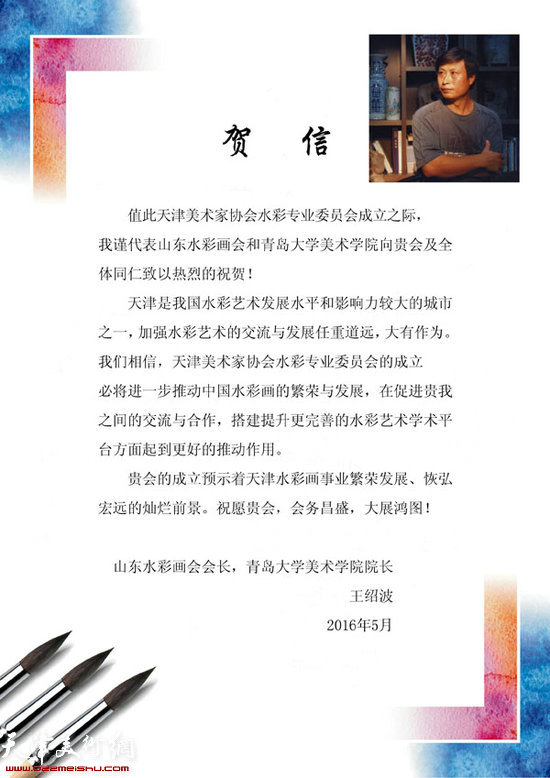 山东水彩画会会长、青岛大学美术学院院长王绍波发来的贺信