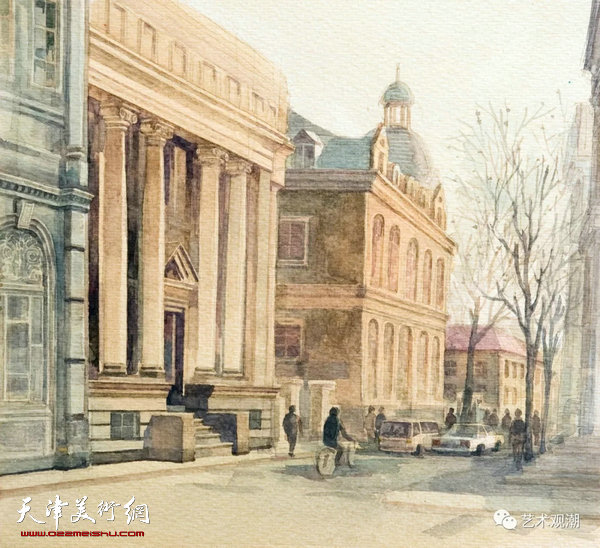 我对水彩技法专门研究的很少,画的水平也不算高,但我非常喜欢画水彩。我认为能表达自己想要表达的东西就够了。而水彩则是便捷的工具,正像石增琇老师所说:“是为画画而画水彩”。我画水彩的原因也是因为我喜欢写生。山水方面我画得很少,因为天津有那么多的小洋楼,特别是在翻新修复之前,虽然破旧却真实地刻录了历史的痕迹,这正是我想要记录和表达的意义。随着我对学科研究的拓展便从“建筑艺术”拓展到了“城市艺术”,而城市好坏的主要因素又是人,所以后来我画的更多是记录和表现城市形形色色人的状态。有个作家曾说我太过注重“审丑”了,那是因为我所要表达的无论是人或物,无论是绘画还是理论,其核心焦点就是“问题”。正是心中有着“真、善、美”,方可敏锐地捕捉到“假、恶、丑”。提出问题是为了更好地解决问题,这正是艺术家的责任。但我又不像传统意义上的批判现实主义者那么锋利,我觉得幽默一点儿更具当代性吧,所以有人称我是“调侃现实主义者”,我更愿意接受。我曾经在水彩团队里提出过“快乐水彩”的口号,但这种快乐并不意味着没有深刻的内涵。