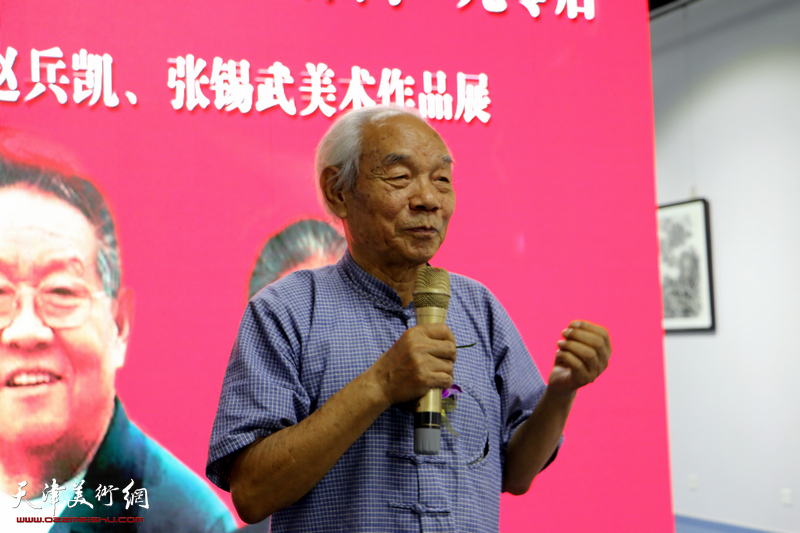 天津市美术家协会秘书长李耀春出席展览开幕活动并致辞。他说,今天沽水双松·津门“九零后”赵兵凯、张锡武美术作品展的举办,在天津美术界影响重大,具有一定的历史意义。赵兵凯、张锡武二位先生将毕生的精力都贡献给了天津美术事业。解放初期,二位先生参加天津美术工作室的建设工作,后又供职于天津美术出版系统。退休之后,又专心从事美术创作。他们为天津的美术工作者树立了榜样。祝福二位先生健康长寿,艺术常青。