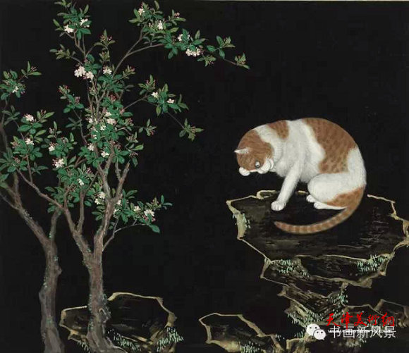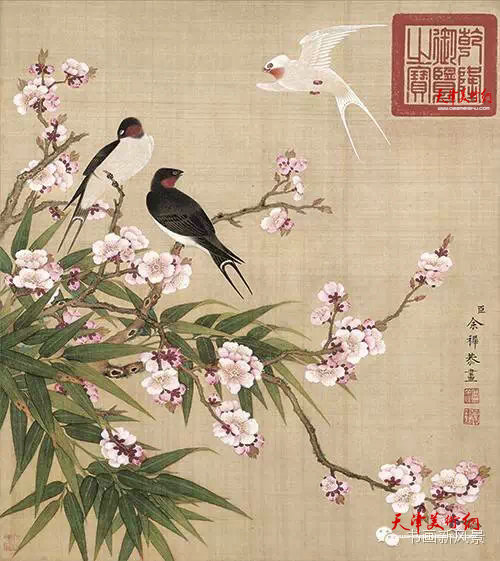 此图写花苑池边,海棠花枝干上立两鸟,似在嬉戏,极有生气。鸟的描绘很精细,笔法工整,造型准确生动,颇得黄筌之法。海棠花下,有玫瑰花、草花和一倒立奇石,石头用小斧劈皴擦,积墨深厚。层 次分明,质感坚实。玫瑰以淡墨双钩,填入粉彩。兼施“没骨”法,以粉色在泥金底上作海棠花,使画面增添了一种秀润明丽之感。