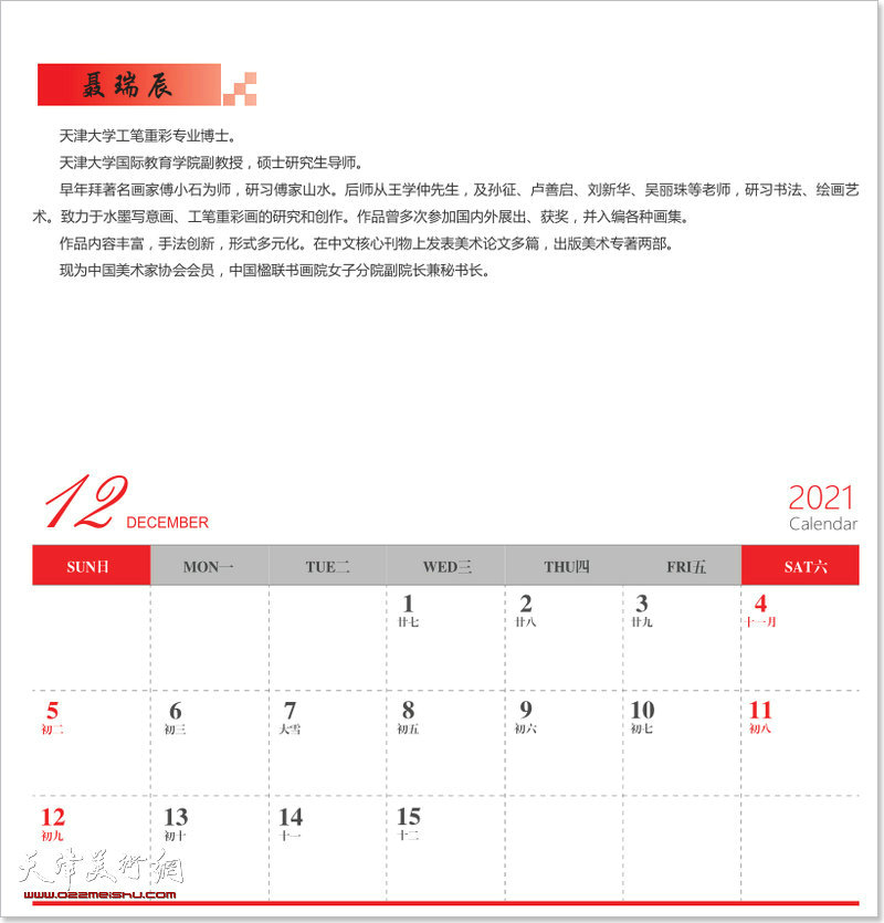 津门女书画家研究院2021农历辛丑年台历 十二月 上旬