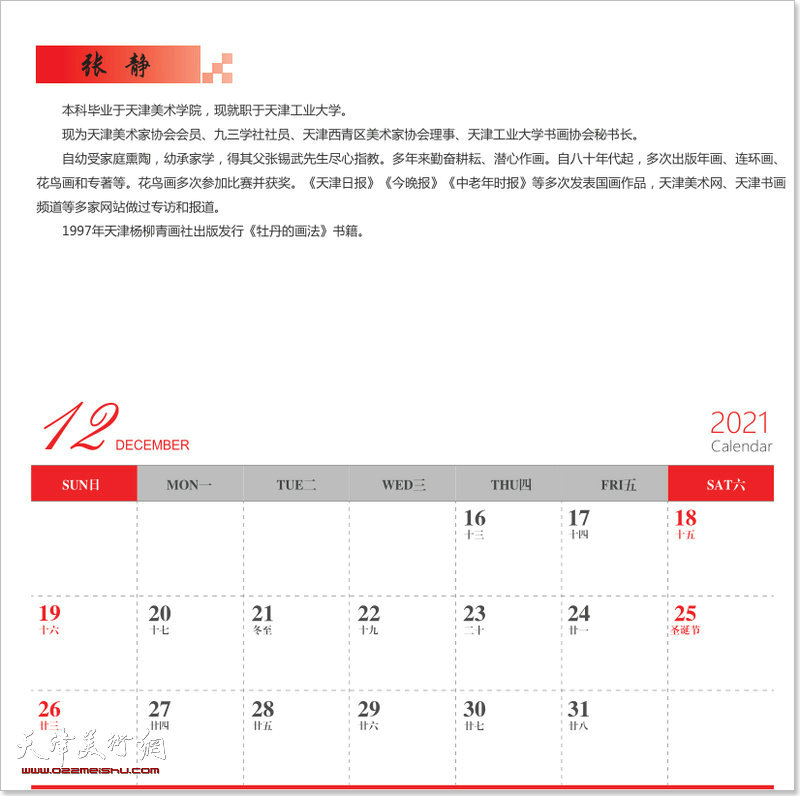 津门女书画家研究院2021农历辛丑年台历 十二月 下旬