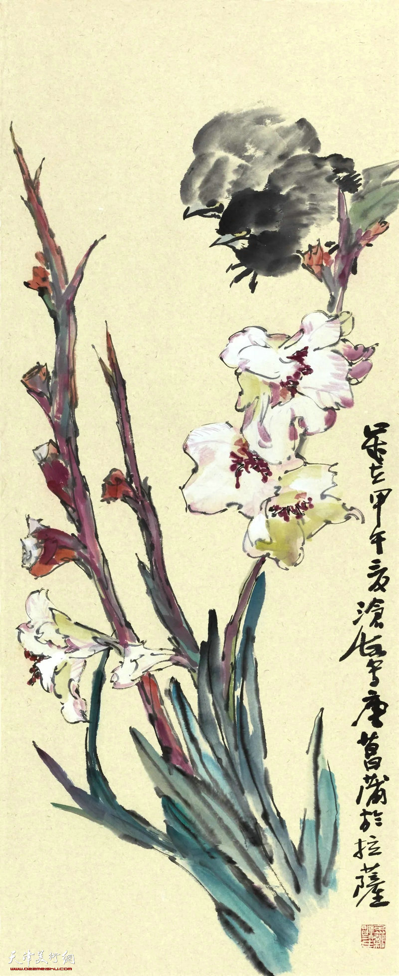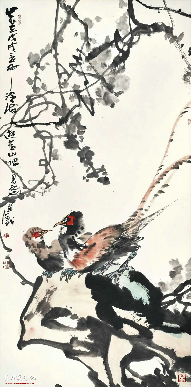 宋代花鸟画已独立成科,尤其是“上有好焉”。宋徽宗赵佶本人便是行家里手,他曾在他的作品《芙蓉锦鸡图》中题道:“秋劲拒霜盛,峨冠锦羽鸡,已知全五德,安逸胜凫鹥。”画面晕染细腻,生动传神,凸显出皇家的富贵雍容之气象。而鸡也因为其“聚五德”而为历代画家所乐于表现。齐白石也画鸡,《他日相呼》、《九吉图》等作品中鸡的形象形态逼真,墨彩淋漓。尹沧海教授笔下的鸡深得传统之三昧,同时又不囿于前人之法,画中之鸡或栖息枝头,或林下争斗,或相知相亲,或教子嬉闹,颇具生意。