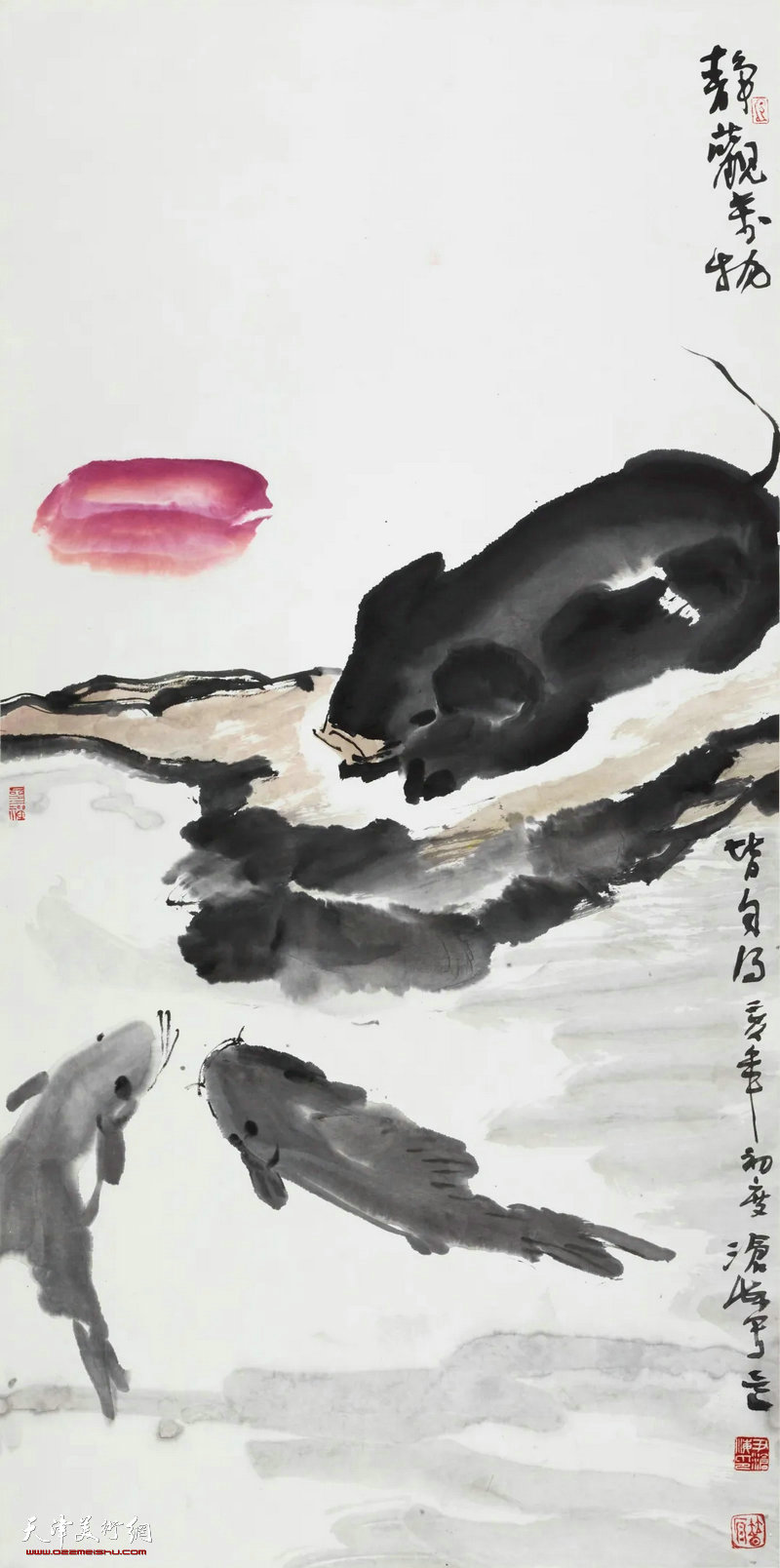 春风里,我们看到尹教授倘徉在新开湖旁,夏天里,我们会时常看到尹教授留连于马蹄湖畔;在秋天里的绵绵细雨中,我们看到尹教授彳亍于野水边,但我们知道,春天里,尹教授徜徉在湖畔不仅仅是为了沐浴桃李春风;夏天里,尹教授留连的也不仅仅是夏天里盛开的荷花;而在秋天里,他的彳亍也不仅仅是令人感伤的诗思与秋雨中的蒲苇……还有尹教授喜爱的鳞介;初冬的霜晨,尹教授会将西门外的鱼儿移到画室内的鱼缸里,在每一个晨昏昼晦里,教授每每向它们投以专注的目光。