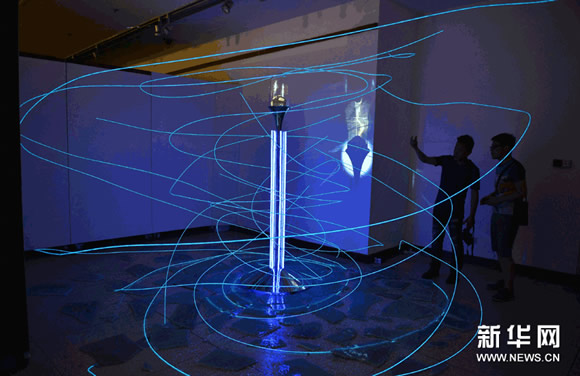 参观者在欣赏跨媒体艺术装置《别偷看》