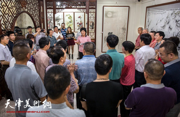 两岸四地中国书画展在潮州丹木美术馆开幕,图为潮州市丹木文化传播公司林小洁致辞。