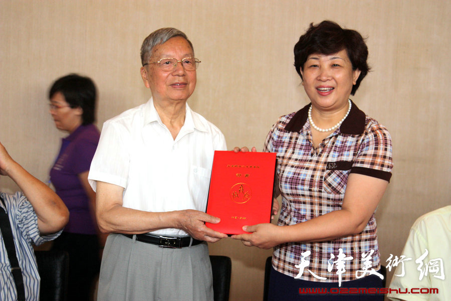 天津体育之光书画院7月19日在市全民健身活动中心成立,图为天津市体育局局长李克敏向钱其璈颁发证书和纪念标识。