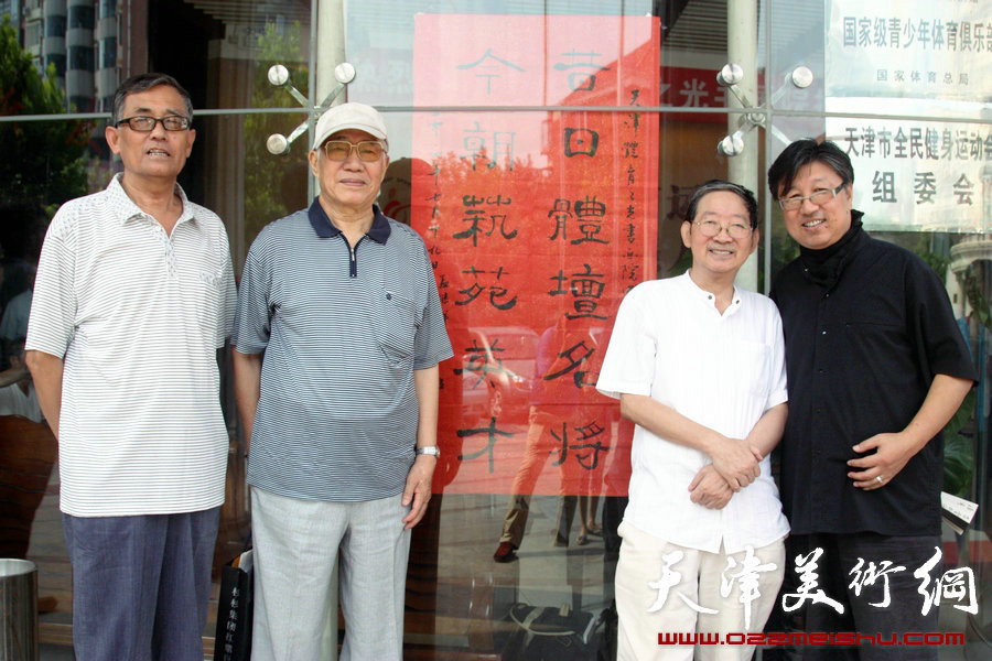 天津体育之光书画院7月19日在市全民健身活动中心成立,图为(左起)刘光焱、孟继祥、王承尧、吕立在刘光焱书法作品前留影。