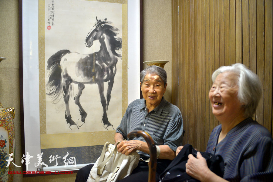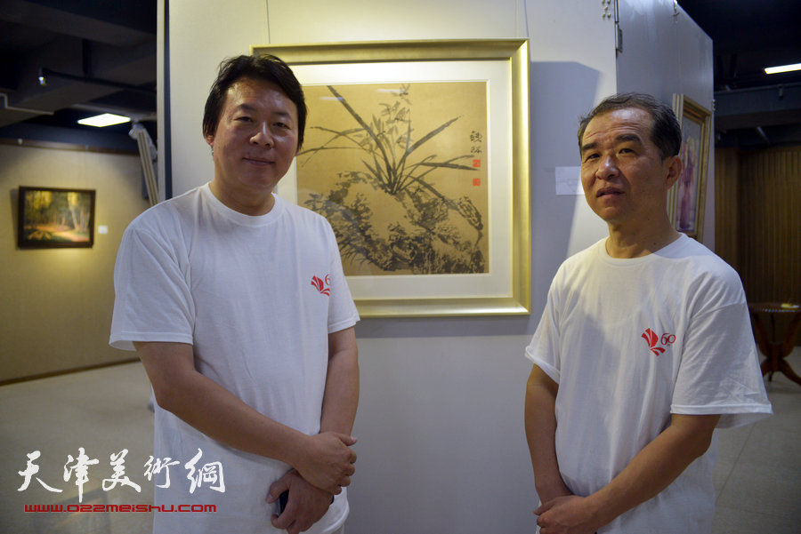 “画韵书香”天津人民美术出版社建社60周年职工书画作品展8月14日在天津人美艺术展厅开幕。图为左起:何东、马驰在展览现场。