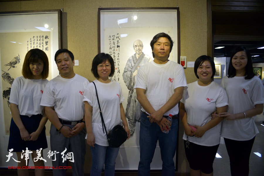 “画韵书香”天津人民美术出版社建社60周年职工书画作品展8月14日在天津人美艺术展厅开幕。图为李毅峰、邢立宏、杨惠东与出版社青年编辑在一起。