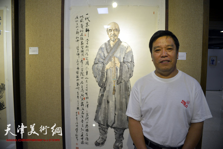 “画韵书香”天津人民美术出版社建社60周年职工书画作品展8月14日在天津人美艺术展厅开幕。图为李耀春在其作品《一代宗师李叔同》前。
