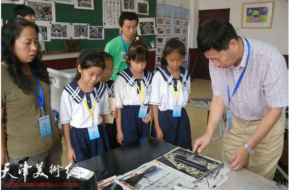 天津师大书画院副院长李桂金教授指导孩子们制作版画