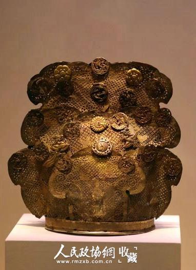 除了黄金面具以外,两顶鎏金银冠静静地在公主和驸马头部放置着。公主的银冠呈高筒式,圆顶两侧有对称的立翅高于冠顶。其实,高翅冠是契丹贵族妇女广泛 流行的一种冠饰。这件银冠用鎏金薄银片分片锤击成各部位的形状,并用细银丝缝缀加固而成。冠顶圆形,两侧立翅高耸,看起来很像鸟飞翔时展开的双翅,冠正面 和两侧立翅镂空并錾刻火焰宝珠、凤鸟和云纹等花纹,冠顶缀饰道教元始天尊像。头顶花冠,高髻长须,宽袖长袍,盘膝坐于莲花之上,后背像光边缘饰9朵灵芝。