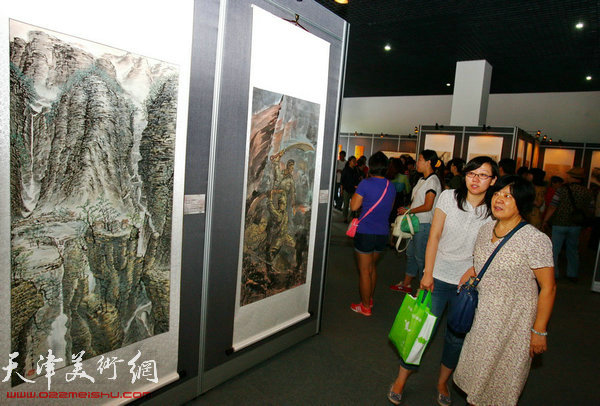 图为天津美协副主席、天津人民美术出版社社长李毅峰、天津美协秘书长李耀春陪同和平区领导观看展览。