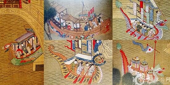看了仇英《清明上河图》中的这些龙舟、凤舟和虎舟,感觉现在每到端午节出来的那些龙舟真是逊毙了,这几个舟的造型完胜当今端午舟。