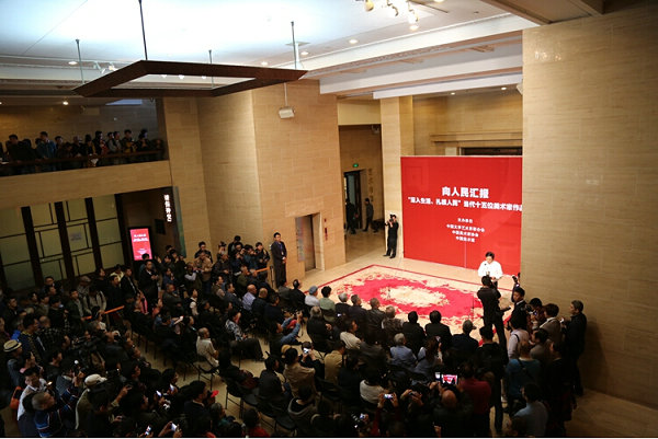 天津美术网讯 10月18日上午10时,由中国文学艺术界联合会、中国美术家协会和中国美术馆共同策划主办的“向人民汇报──‘深入生活、扎根人民’当代十五位美术家作品展”在中国美术馆隆重开幕。中国文联党组书记、副主席赵实,中国文联党组成员、副主席左中一,中国文联党组成员、书记处书记郭运德,中国文联副主席、中国美协主席刘大为,中国美协副主席、中国美院院长许江,中国美协副主席、中国美术馆馆长吴为山,中国美术馆常务副馆长马书林,中国美协分党组成员、副秘书长杜军,中国美术馆副馆长胡伟、安远远等领导,参展美术家李焕民、刘文西、徐匡、吴宪生、赵奇、骆根兴、陈坚、郑艺、于小冬、陈树东、柳青等,以及各界嘉宾、媒体记者数百人参加了开幕式。开幕式由中国美协分党组副书记、秘书长徐里主持,左中一、刘大为、吴为山分别代表主办方在开幕式上致辞。
