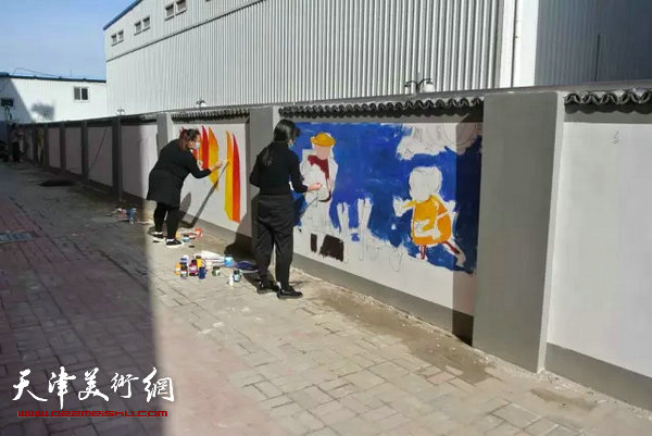 天津美术网讯 10月24日-25日,在著名画家肖英隽老师的带领下,天津工业大学艺术专业的21名大三学生来滨海新区宝山道乾庄文化广场创作艺术绘画长廊。