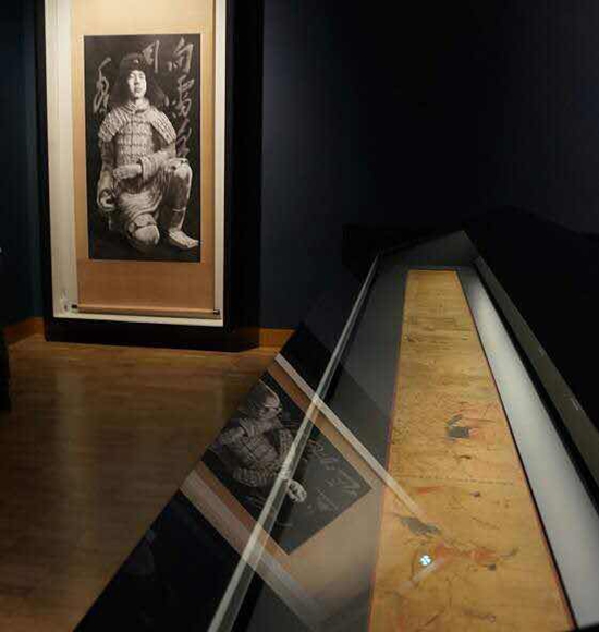 这次展出的中国当代画家曲磊磊两幅画作,属于大英博物馆永久收藏。均为水墨宣纸,6尺整张立轴。中国国民家喻户晓、钟情于畅销几十年的小说《林海雪原》的军 旅大作家---曲波。曲波之子曲磊磊秉承家风,现为著名旅英中国当代艺术家,星星画展创始人之一。《雷锋》一画是他创作的《帝国》系列之一幅,以超现实主 义手法,将雷锋和秦陵兵马俑合而为一,在两千年的历史契合中,探讨生命的价值和人性的尊严;《旅程》一画,是他的《面对未来》系列中的一幅,以手为媒介, 表现当今世界不同文化和族 群间的共同理想和诉求,走出中国,走向世界,显示出磅礴正气。磊磊认为绘画永远都是思想者和手艺人相结合的艺术,在几十年的探索中默默耕耘,认真严肃,远 离名利,把中国传统材料,技法,笔墨的浓淡干湿,勾皴点染,和 西方艺术的光影造型,人体解剖等表现方法融为一体,‘计黑当白’,在水墨语言的探讨,开拓中,走出一条属于自己和这个时代的路。