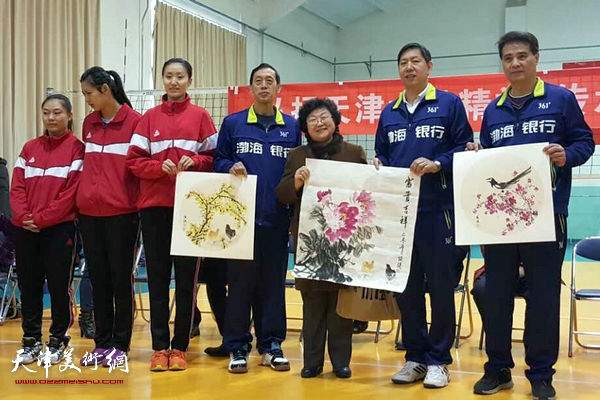 天津体育之光书画院书画家于焕瑛向天津女排赠送画作。