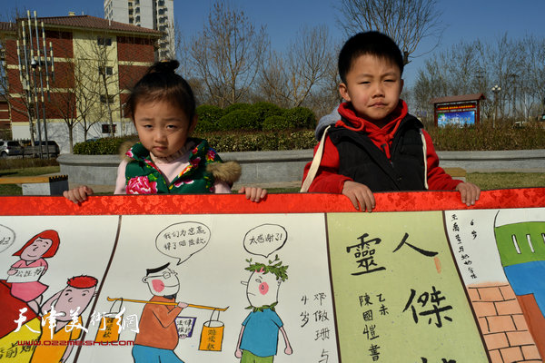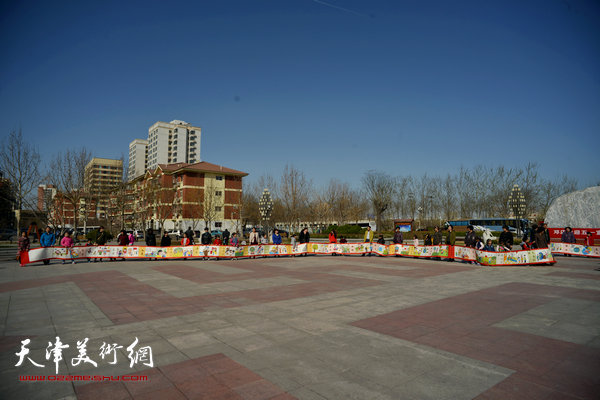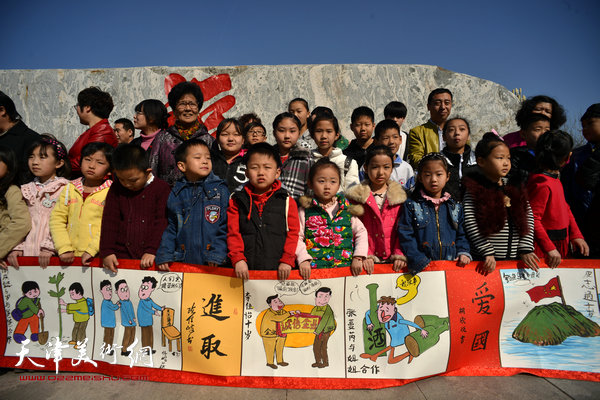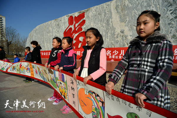 天津美术网讯 百年吐曜,大梦含章。为丰富社会主义核心价值观教育实践载体,让少年儿童在寓教于乐中深入体会、理解核心价值观,邓店村组织孩子们绘制百米长卷,图文并茂地诠释、解读孩子们心中的核心价值观。这幅长卷作品,以社会主义价值观为题材,由十月书画院近百名小学员绘制完成。从构思、绘制、装裱,历时3个多月。画卷长100米,其中绘画作品有137幅,书法作品有66幅,共计203幅,生动传播了社会正能量,使社会主义核心价值观的种子在他们心中生根发芽,增进爱祖国、爱家乡、知荣辱、明大义的情怀。