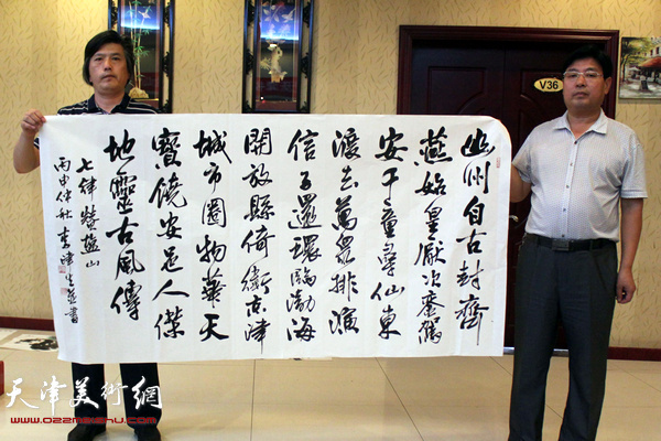 政协副主席吕少军和书法家李津生共同展示创作的七律赞盐山。