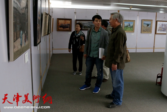 塘沽老版画家王颂与油画家陈会中老师在观看展览