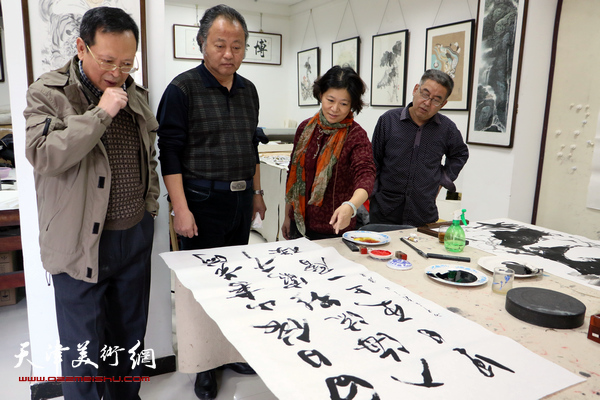 孟昭丽现场创作,孙伟、石伟、王群英、卢勇在现场。