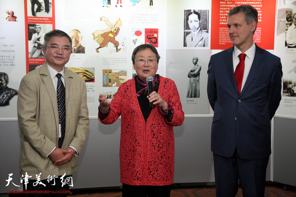 比利时驻华大使马怀宇,天津市社会科学界联合会党组书记靳方华,布鲁塞尔同题展览策划人查尔斯·拉格朗日先生在现场观展。