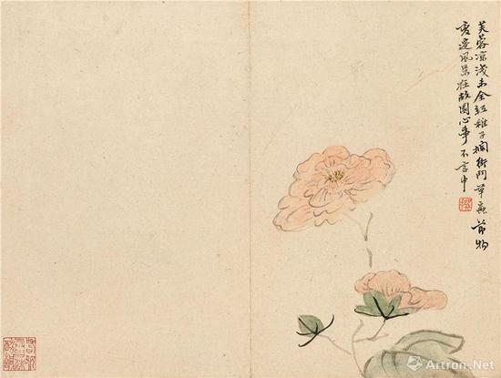 杨法(1696—约1762后),南京人,诗书画印兼擅。他传世画作极少,扬州博物馆藏其两片册页,一写月季,一作绣球,设色小写意,在“勾花点叶”派基础上略有变化。故宫博物院藏其墨花册,笔墨简放,略类青藤,署款“丙子”为乾隆二十一年,其年六十一。