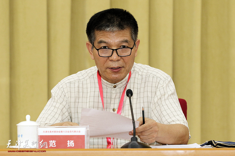 天津市美术家协会副主席、天津画院院长范扬作修改章程的说明。