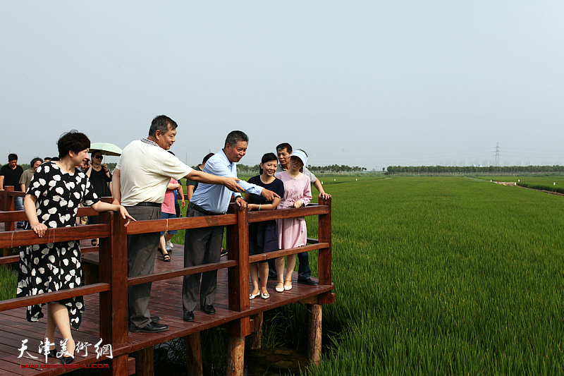 天津画院一行首先参观了津南区绿色生态园,小站稻试验田等地,对津南区特色旅游文化给予了高度评价。画家们纷纷表示:“冒着酷暑深入畅游绿色生态园是另外一番享受,园内绿树成荫,曲径通幽,200余亩的湖面在绿树环抱当中,碧波荡漾,非常适合采风写生创作。”在小站稻田埂地头,一股稻香扑面而来,令人心旷神怡。稻田边的水车、观景台也都成为了画家们竞相体验的胜地。