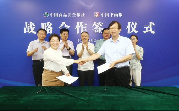 天津美术网讯 为充分发挥中国食品安全报社和中国书画报的平台、资源、市场、人才等优势,共同推进双方在食育、美育等方面的合作,助力健康中国,共铸美丽中国梦,8月24日,中国食品安全报社与中国书画报战略合作签约仪式在京举行,由中国食品安全报社执行总编辑、常务副社长李涛和中国书画报常务副总编辑路洪明分别代表双方签署了战略合作协议。作为双方合作的见证嘉宾,中国政策专家库专家委员会委员、中国作家协会会员、中国书法家协会会员周惠表示,中国食品安全报社和中国书画报分别是双方各自领域的龙头媒体,乐见双方开展多元合作,携手共赢,以创新精神增强食育美育的宣传渠道,通过食育加美育的强强联合,培养人民群众健康饮食行为习惯,提升全民健康素养水平。